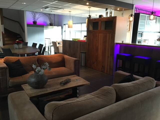 de open keuken, de bar en de diverse zitjes. Alles is vrij toegankelijk; er zijn geen deuren die u afsluiten van uw gasten. De sfeer is landelijk modern te noemen en door de aanwezige sfeerverlichting kunt u ten allen tijde ervoor kiezen om de sfeer intiemer te maken. U kunt zelf, in overleg, uw eigen inrichting/opstelling bepalen.